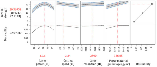 The optimized process parameters, which provide maximum tensile strength, are presented in the optimization diagram in Figure 7. The statistical model proposes that maximum tensile strength values (20.37 N/mm) are achieved using the laser power of 60.6%, cutting speed of 3.24%, resolution of 2500 Hz, and a paper material grammage of 326.85 g/m2.