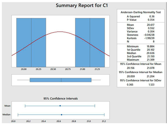In order to verify the validity of the adopted regression model in terms of process optimization, a verification of proposed optimal process parameters was conducted with eight additional runs (Table 8). Based on the 95% confidence interval (20.16–21.08 N/mm), which is presented in Figure 8, it can be concluded that the proposed optimized tensile strength of 20.37 N/mm fits in the confirmatory run confidence interval, confirming the adequate selection of the regression model.