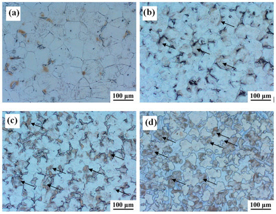 OM images of the experimental alloys: (a) 0Zn, (b) 0.7Zn, (c) 1.5Zn, and (d) 3.3Zn.