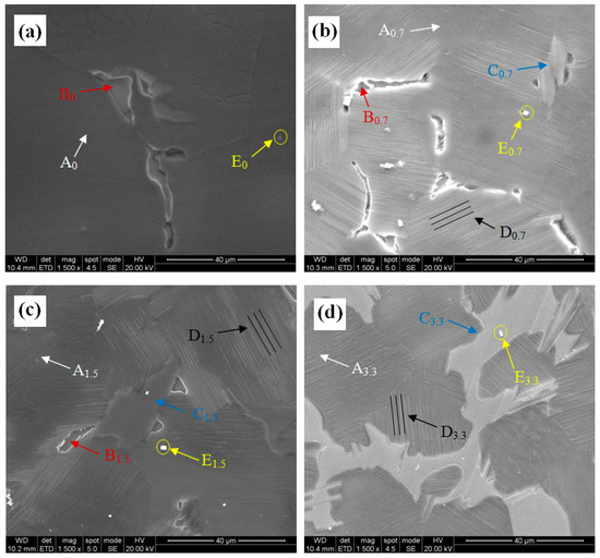 Figure 2 shows the SEM images of the experimental alloys at different Zn contents. For the 0Zn alloy, the microstructure was mainly composed of an α-Mg matrix (A0 point in Figure 2) and a second phase (B0 point in Figure 2), wherein the second phase exhibited eutectic phases. For the alloys with Zn addition, the second phases were composed of two phases, the first one was the eutectic phase (B point in Figure 2b–d) and the second one was the raised bulk phase (C point in Figure 2b–d). As the Zn content was increased, the volume fraction of the raised bulk phase was increased, while the volume fraction of the eutectic phase was decreased. In addition, platelets (D point in Figure 2) and cuboid phases (E point in Figure 2) were observed. The platelets were parallel to each other in the same grain.