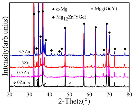 To reveal the crystal structures of the second phases, XRD characterization was conducted, and the XRD patterns of the experimental alloys with different Zn contents are shown in Figure 3. The XRD pattern of the 0Zn alloy mainly showed the diffraction peaks of the α-Mg matrix and the Mg5(GdY) phase, which correspond to A and B in Figure 2, respectively. The XRD pattern of the 0.7Zn alloy mainly showed the diffraction peaks of the α-Mg matrix, while the Mg5(GdY) phase, the Mg12Zn(YGd) phase, and the Mg5(GdY) phase exhibited smaller diffraction peaks than the 0Zn alloy. An increase in the Zn content (1.5 wt%) resulted in a further decrease in the Mg5(GdY) phase diffraction peak intensity, while that of the Mg12Zn(YGd) phase increased. The diffraction peaks of the α-Mg matrix and the Mg12Zn(YGd) phase were mainly found on the XRD pattern of the 3.3 Zn alloy, although the diffraction peaks of the Mg5(GdY) phase disappeared. Interestingly, the Mg12Zn(YGd) phase was determined to be an LPSO phase [23]. Therefore, the Zn addition promoted the formation of the LPSO phase, but suppressed the formation of the Mg5(GdY) phase. Combined with the results of the SEM images and XRD patterns, the second phases B and C in Figure 2 were determined to be Mg5(GdY) and LPSO phases, respectively.