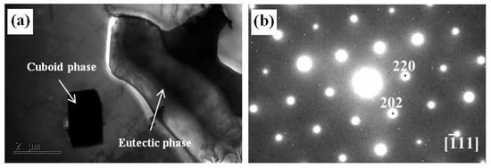 In order to further compare and reveal the similarities and differences of the second phases in the alloys with and without Zn addition, the microstructures of the 0Zn and 1.5Zn alloys were characterized by TEM. Figure 4 shows the TEM bright-field (BF) image and the corresponding selected area electron diffraction (SAED) pattern of the 0Zn alloy. The cuboid phase and the eutectic phase were observed near the grain boundary. The electron beam could not penetrate the cuboid phase, and the corresponding SAED pattern was not obtained. The EDS results indicate that the cuboid phase had a chemical composition of 8.34at% Mg–28.73 at% Gd–62.92at% Y, which is a RE-rich phase. The SAED pattern suggests that the Mg5(GdY) phase (FCC, FM, a = 2.23 nm) was a eutectic phase.