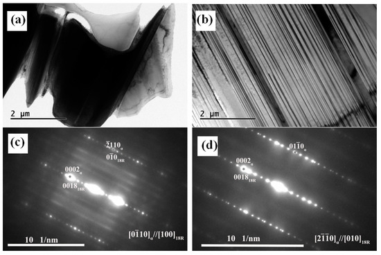 Figure 5 shows the TEM analysis results of the 1.5Zn alloy. As shown in Figure 5a and Figure 5c, the block phase had an 18R LPSO phase. In addition to the bulk LPSO phase at the grain boundary, some lamellar structures were distributed in parallel along one direction near the grain boundary. According to the diffraction pattern of the lamellar structure, the lamellar structure was also an 18R LPSO phase.