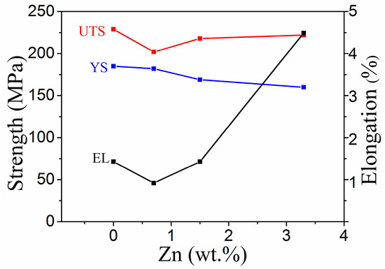 Figure 6 shows the changes in the tensile strength, yield strength, and elongation of the alloy with Zn content. An increase in the Zn content first resulted in a decrease in the tensile strength of the alloy, followed by an increase, although the range of the changes was not large. The yield strength gradually decreased with an increase in the Zn content, while the elongation after fracture first decreased and then increased with an increase in the Zn content, especially when the Zn content exceeded 1.5 wt%. The 0Zn alloy exhibited a relatively high strength (UTS of 211 MPa and YS of 164 MPa) but relatively low ductility (EL of 1.2%). The 0.7Zn alloy exhibited a reduced UTS of 201 MPa, YS of 146 MPa, and EL of 1.1%. For the 1.5Zn alloy, an improved UTS of 218 MPa and EL of 2.0% were observed, while YS was slightly decreased. As the Zn content increased to 3.3 wt%, the YS significantly decreased by ~44 MPa (from 164 MPa to 120 MPa), while the EL increased from 1.2% to 4.1% compared with that of the 0Zn alloy. Generally speaking, the 0Zn alloy exhibited the highest strengths—a tensile strength and yield strength of 229 MPa and 185 MPa, respectively—while the 3.3 wt% Zn alloy showed the highest elongation after fracture (4.5%).