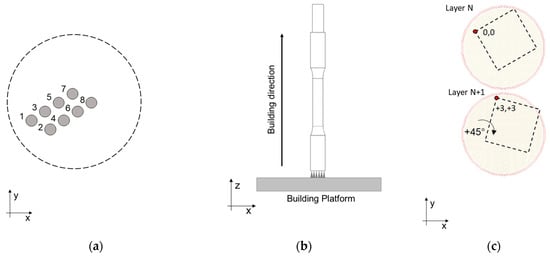 A total of 24 samples were arranged in four identical building platforms of 8 specimens each to ensure an equivalent in-process thermal cycle. Platforms were designed to enhance the quality of printed parts that, in the absence of pre-heating as in this case, requires limiting the cooling of samples between two subsequent layers (Figure 1a).