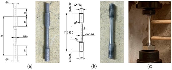 Tensile samples geometry and dimensions: (a) near-net-shape sample obtained by PBF-LB process, (b) final sample after machining. In (c): equipment for tensile tests.
