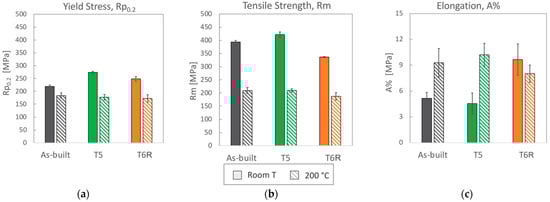 (a) Yield stress, (b) tensile strength, and (c) elongation to failure (mean value and standard deviation) obtained from tensile tests performed at room and high (200 °C) temperature for the as-built, T5, and T6R AlSi7Mg PBF-LB alloy.