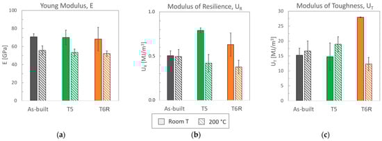 (a) Young, (b) resilience, and (c) toughness modulus (mean value and standard deviation) obtained from tensile tests performed at room and high (200 °C) temperature for the as-built, T5, and T6R AlSi7Mg PBF-LB alloy.