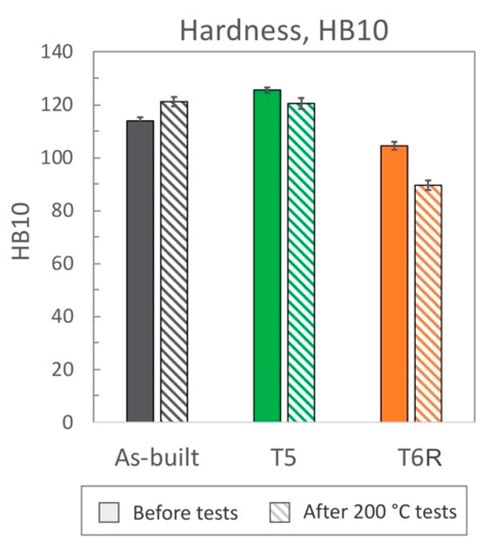 Sample hardness was evaluated following the Brinell method (HB10, with 2.5 mm ball diameter, 62.5 kgf force, and a force-diameter ratio equal to 10 [41]) before tensile tests and after the tests performed at 200 °C; the latter is defined as residual hardness.