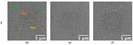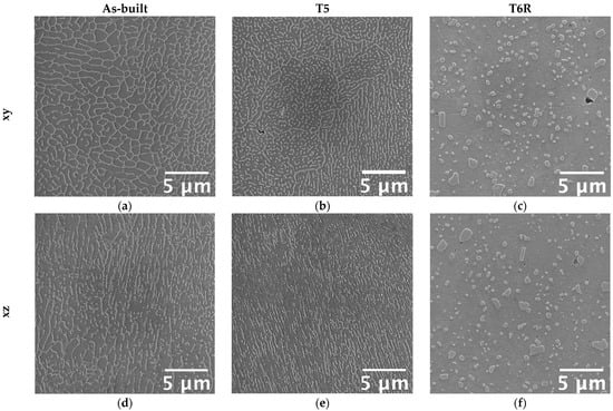 Furthermore, due to the repeated heat cycles experienced during the PBF-LB process, the morphology of the eutectic-Si network is not homogeneous. In particular, it changes according to the considered region of the melt pool formed due to the interaction between the laser beam and the powder bed [8,53]. If close to the core of the melt pool (MPC in the figure), the network is fine and interconnected; if close to the border (MPB in the figure), it is slightly coarser and partially discontinuous, while in the heat-affected region between consecutive layers (HAZ in the figure), it is almost entirely interrupted. Therefore, in the as-built condition, the peculiar microstructure is extremely inhomogeneous and closely dependent on the process parameters, such as building direction and scanning strategy. The T5 alloy was still characterized by the extremely fine cellular structure in the as-built condition (Figure 7b,e). However, in some regions, the eutectic-Si network appeared slightly fragmented, less defined, and thinner than the as-built one. Finally, the T6R treatments deleted any trace of the manufacturing process (Figure 7c,f). As a result, the eutectic-Si network completely broke down, and the microstructure consisted of a fine distribution of globular and sub-micrometric Si-rich particles dispersed in the α-Al matrix. T6R treatment also succeeded in homogenizing the microstructure, as no difference in morphology was evidenced between the xy and the xz planes.