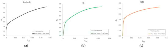 Significant differences among the temper conditions were found in the work-hardening behavior. Further analyses were conducted on the plastic region of true stress-strain curves to correlate it to the microstructural features. In the literature, the analysis of the plastic region of stress-strain curves is used to assess the structural integrity of the alloy as the presence of defects, like internal material discontinuities, affects the plastic behavior of the alloy [36,37,54]. While yield stress is marginally affected by defects, Rm and A% strongly depend on it [33]. In the case of PBF-LB, parts are characterized by specific internal defects, such as gas porosities and lack of fusions. Their effect on the mechanical response should be considered. Therefore, the Voce equation and Kock-Mecking model [55,56] investigated the work-hardening behavior of as-built, T5, and T6R samples. Voce equation (Equation (1)) was developed to describe the plastic flow behavior, and it is more effective in the case of fcc-metals than other well-known laws such as Hollomon, Ludwik, and Ludwigson ones [57]. As shown in Figure 8, the Voce equation can be proficiently used also to describe the behavior of the AlSi7Mg PBF-LB alloy.