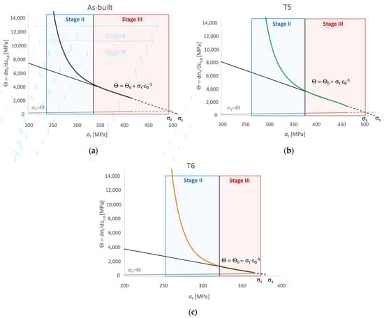 where work hardening rate when and is a parameter mainly depending on Stage II work hardening rate and strain rate. According to Angella et al. [54], this parameter can be obtained based on the Voce equation as . From a physical point of view, is an athermal constant that describes the dislocation storage rate and is inversely related to the characteristic dimension of the microstructure, while is a thermal parameter related to the dynamic recovery [54,55,57].