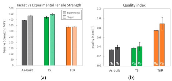 Results from the analyses of the strain hardening behavior AlSi7Mg PBF-LB alloy in the as-built, T5, and T6R temper condition: (a) experimental tensile strength obtained from tensile tests compared to the target one; (b) quality index (QD index is based on ductility, QT index is based on toughness).