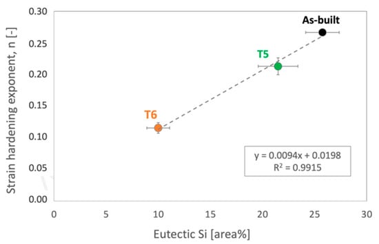 Correlation between strain hardening exponents n measured from true stress-true strain experimental curves and area% of the Si-rich region evaluated on FEG-SEM micrographs for the as-built, T5, and T6R AlSi7Mg PBF-LB tensile samples.