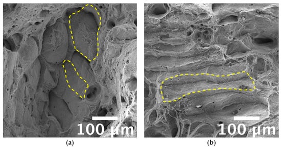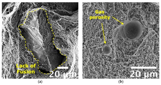 Furthermore, Si particles were found inside dimples in the T6R alloy (Figure 13c,f) that, in most cases, appeared fractured. Due to the flat surfaces of broken Si particles, it can be inferred that a brittle fracture mechanism occurred for them, as also observed by Trevisan et al. [16]. Accordingly to microstructural observations, the finest dimples were observed for the as-built and T5 alloys because of the fine cellular microstructure observed in these conditions. The absence of appreciable microstructural inhomogeneities, as Si-rich particles formed after T6R, delayed dimples nucleation and hindered their growth, as confirmed by the overall fine dimples dimension (approx. 1 µm in the case of as-built alloy). These outcomes agree with the previously discussed tensile results in which both as-built and T5 samples showed greater ultimate tensile strength and hardening than T6 samples. Such finesse was still preserved by the as-built alloy tested at high temperatures, supporting the good overall mechanical behavior discussed in the previous section. It is worth mentioning that only in the case of tests conducted at high temperatures on as-built and T5 samples it was possible to recognize traces of laser scan track on fracture surfaces, as evidenced in Figure 14. Such features evidence the de-cohesion of successive processed layers in correspondence with HAZ regions [63]. Other authors also observed this feature on samples built perpendicularly to the platform, as in the present work [64,65]. However, different from this study, the literature work adopted a platform pre-heating (150–200 °C) for the PBF-LB process and evidenced the presence of scan tracks on surfaces of samples tested at room temperature. Therefore, the de-cohesion of successive processed layers may be promoted by microstructural modifications induced by exposure to high temperatures during the process or testing. Lastly, the primary defects of this alloy affecting the mechanical behavior, and thus the structural integrity, are represented in Figure 15. Defects found on fracture surfaces of tensile samples, regardless of temper condition or testing temperature, can be divided into two main categories: (i) large and irregular lack of fusion, with dimensions usually greater than 100 µm and an oxidized surface (Figure 15a, highlighted in yellow dashed line); (ii) spherical gas porosities with dimension in the order of tens of micrometers (Figure 15b, highlighted by yellow arrows).