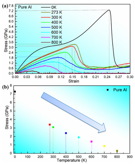 As shown in Figure 2, we simulate the mechanical properties of perfect aluminum crystals at different temperatures. In the figure, we have chosen 0 K, 273 K, 300 K, 400 K, 500 K, 600 K, 700 K and 800 K as the temperature nodes. From the figure, we can see that the tensile properties of perfect aluminum have a decreasing trend with the increase of temperature. The corresponding maximum stresses at 0 K, 273 K, 300 K, 400 K, 500 K, 600 K, 700 K and 800 K are 7.2 GPa, 3.4 GPa, 3.1 GPa, 2.5 GPa, 1.9 GPa, 1.4 GPa, 0.9 GPa and 0.3 GPa, respectively. Experimentally, the mechanical properties of aluminum alloys are affected by temperature [41], and the stress in aluminum alloys decreases with increasing temperature [42,43], which is in agreement with our theoretical results.