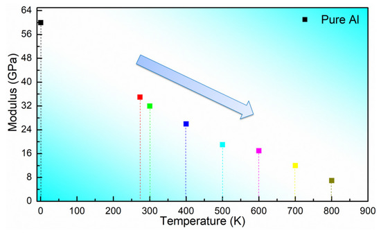 As shown in Figure 3 and Table 2, we have calculated the modulus of perfect aluminum crystals at different temperatures. In the figure, we have selected 0 K, 273 K, 300 K, 400 K, 500 K, 600 K, 700 K and 800 K as the temperature nodes to be studied. The calculated results show that the moduli at 0 K, 273 K, 300 K, 400 K, 500 K, 600 K, 700 K and 800 K are 60.1 GPa, 35.2 GPa, 32.4 GPa, 26.1 GPa, 19.3 GPa, 17.2 GPa, 12.1 GPa and 7.2 GPa, respectively. From the figure, we can see that the modulus of the perfect aluminum crystals is around 60 GPa at theoretical case 0 K, which is very close to the theoretical modulus of perfect aluminum crystals (69–71 GPa). We further observe from the figure that the modulus of perfect aluminum decreases approximately linearly with temperature, and the elastic modulus at 800 K decreases by 62.5% relative to room temperature (300 K).