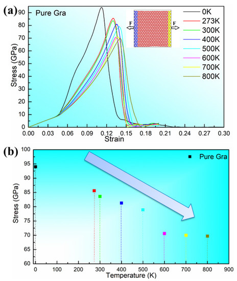 Before studying the composite properties, we investigate the mechanical behavior of perfect graphene. As shown in Figure 4 and Table 3, the theoretical tensile stresses of perfect graphene at different temperatures were studied. In this case, a total of 51,200 C atoms are included in the model, and in the figure, we fix one end of it. As shown in the figure, the blue area spheres as well as the yellow area spheres are the atoms at the fixed end as well as the atoms at the mobile end, respectively. As shown in Figure 4, we investigated the stress–strain relationships at 0 K, 273 K, 300 K, 400 K, 500 K, 600 K, 700 K and 800 K, respectively. We can see from Figure 4 that the highest point of the stress–strain curve tends to decrease as the temperature increases, except for the overall rightward shift of the curve as the temperature increases.