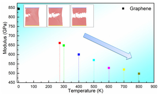 As shown in Figure 5, we have calculated the modulus of perfect graphene at different temperatures. In the figure, we have selected 0 K, 273 K, 300 K, 400 K, 500 K, 600 K, 700 K and 800 K as the temperature nodes. From the figure, we can see that the modulus of perfect graphene at the theoretical case 0 K is around 850 GPa, which is very close to the theoretical modulus of perfect graphene (1 TPa = 1000 GPa) [44]. We further observe from the figure that the modulus of perfect graphene decreases approximately linearly with temperature, and the elastic modulus decreases by 23.2% at 800 K relative to room temperature (300 K).