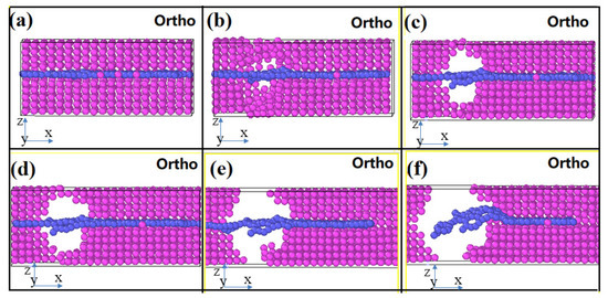 As shown in Figure 10, we investigate the tensile fracture behavior of three-layer graphene in graphene/aluminum composites. From Figure 10, we can see that at the beginning of strain loading, “hole defects” appear first at the contact between the outer layer of graphene and the matrix, and as the strain continues to increase, the “hole defects” show a tendency to expand gradually, and finally the matrix fractures. At this time, the three layers of graphene connected the two sides of the matrix, acting as a “bridge”, so that the composite material did not fail. With the further increase of strain, the bottom graphene layer slowly withdraws from the matrix, and at this time, the strength of the composite comes from the shearing action between the inner layer graphene and outer layer graphene and the shearing action between graphene and the surface of the matrix. With further increase in strain, the underlying graphene is withdrawn from the matrix as well as from the intermediate graphene, leading to complete failure of the composite. The strong toughening and fracture behavior of multilayer graphene/Al composites were investigated experimentally by Wu et al. [46,47], and their results indicate that the interlayer bonding force is weaker than the graphene–matrix interface bonding force, resulting in the mislayer slip of graphene, which is in agreement with our calculated results.