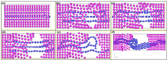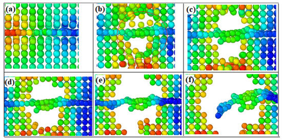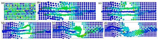 From Figure 11a,b, we can see that at the beginning of the stretching, there is a yellow-green distribution in the aluminum substrate as well as in the graphene, which means that the stress is distributed in the aluminum substrate as well as in the graphene at this time. As the strain increases, we can see from Figure 11d–f that the yellow-green color is mainly distributed between the graphene layers and between the outer graphene and the aluminum substrate. From Figure 11, we can see that at the beginning of strain loading, the stresses are mainly concentrated on the two outer graphene layers. With further increase of strain, the stresses are concentrated between the outer graphene layers and the matrix. It is further observed that the bottom graphene layer bears the main stress before the failure of the composite. At the moment of composite failure, the stresses are mainly concentrated at the edge of the graphene and the matrix. The study of the failure behavior of multilayer graphene in graphene/aluminum composites provides some theoretical references for further research on graphene-reinforced metal matrix composites, thus enhancing the mechanical properties.