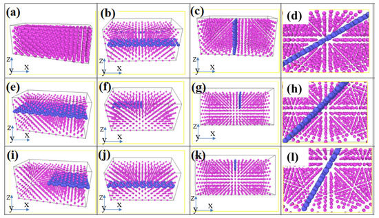 As shown in Figure 8, we further investigated the effect of graphene size as well as angle on the mechanical properties of graphene/aluminum composites. Figure 8a shows a perfect aluminum matrix; Figure 8e shows a composite model with 100% graphene-to-matrix area ratio; Figure 8b,i show a composite model with 50% graphene-to-matrix area ratio in the x-direction and y-direction, respectively; Figure 8f,j show a composite model with 25% graphene-to-matrix area ratio in the x-direction and y-direction, respectively. Figure 8c,g,k show models of composites with graphene-to-matrix area ratios of 100%, 50% and 25% in the vertical and tensile directions, respectively; Figure 8d,h,l show models of composites with graphene at angles of 30, 45 and 60 with the tensile direction, respectively. As shown in Figure 9, we calculate the mechanical properties of the above models separately. From Figure 9, we can see that in the parallel x-direction, the tensile stress tends to increase as the percentage of graphene area increases; in the vertical x-direction, the tensile stress tends to decrease as the percentage of graphene area increases; in the angle with the x-axis, the tensile stress tends to decrease as the angle between graphene and the x-axis increases. At the same time, we can also see from the figure that above the dashed line, the composite tensile stresses are all greater than the single crystal aluminum tensile stresses, which have a strengthening effect.