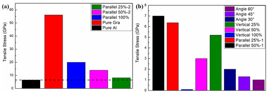 Mechanical properties of different forms of graphene/aluminum composites. The tensile stress of structures with different area ratios of graphene parallel to the stretching direction are shown in (a), and the tensile stress of structures with different graphene angles to the stretching direction are shown in (b).