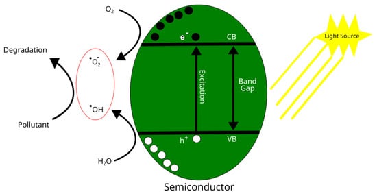 In environmental remediation, these radicals will react with the pollutants, leading in many cases to mineralization, which is the process that decomposes the pollutant into CO2 and H2O. A scheme of this particular application is shown in Figure 5.