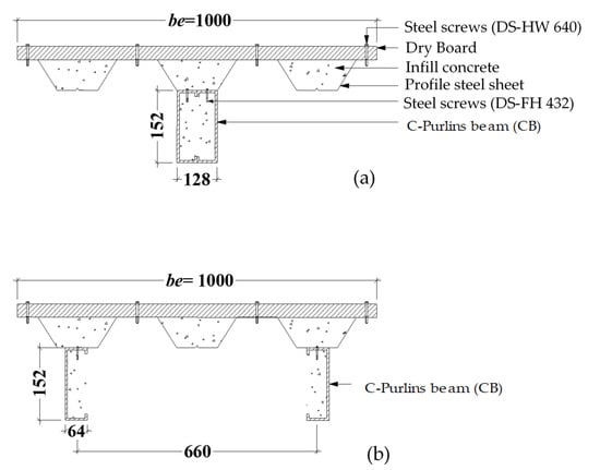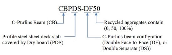 In this study, six (6) full-scale beam–slab specimens were prepared using double steel C-Purlins beams connected from top to flange with profile steel sheet (PSS) deck slabs covered with dry board (DB) sheets. Each specimen was filled with a concrete mixture containing 0%, 50%, or 100% recycled aggregate. In addition, each specimen’s beam was fabricated with two pieces of C-Purlins either connected face-to-face or separated. The investigated CBPDS specimens’ nomenclature is described in Figure 1, and details are provided in Table 1. All sections (C-Purlins, PSS, and DB) of the CBPDS specimens were connected using self-tapping steel screws for quick and simple assembly. The typical details of the investigated CBPDS specimens are shown in Figure 2 and Figure 3.
