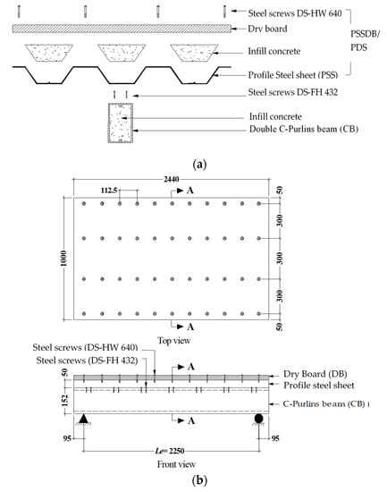 In addition, three steel coupons were prepared, using steel PSS and C-Purlins, and tested in accordance with ASTM E8/E8M-2009. This study used the same Primaflex DB sheet that was used in [7,9,10]. Table 3 presents the properties of these materials (C-Purlins, PSS, DB, and concrete mixtures). Lastly, two types of self-tapping steel screw were used to connect the parts of the CBPDS specimens, which are DS- and DS-FW640 [7,9,10].