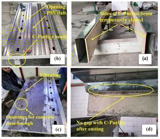 Pouring the concrete inside the CBPDS specimens; (a)cover the C-Purlins sides, (b) provide openings, (c) pouring the concrete with vibrating, and (d) No concrete gap.