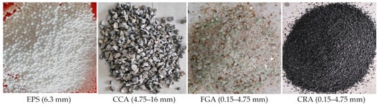 Three different concrete mixtures were prepared, each containing a different amount of recycled aggregates (0%, MC0; 50%, MC50; and 100%, MC100) which were replaced by volume with raw fine and raw coarse aggregates. The concrete mixtures were mainly prepared using Malaysian Portland cement (MS EN 197-1 CEM II/B-L 32.5N), washed sand (density, 1570 kg/m3), and crushed limestone coarse aggregates (density, 1498 kg/m3). A high water/cement ratio (0.5) was used to increase the concrete mixture’s workability while it was poured inside the CBPDS specimens. In this study, combinations of four different waste materials were used as recycled aggregates (EPS, CCA, CRA, and FGA), as shown in Figure 5. Sieve analysis was performed in the laboratory for three recycled materials, as shown in Figure 6. The densities of these recycled aggregates were 1278 kg/m3 for the CCA, 9.5 kg/m3 for the EPS, 600 kg/m3 for the CRA, and 1220 kg/m3 for the FGA. Table 2 presents the proportions of these concrete mixtures. After 28 days, three cubes (100 mm) were taken from each mixture and tested in accordance with BS1881-Part116 1983. In general, at the preliminary lab work stage, five concrete mixtures that contain different combinations of recycled aggregates were suggested. Then, one mixture was chosen to apply as infill recycled concrete material for the investigated CBPDS specimen, specifically the mixture with optimal content of recycled aggregates and better concrete strength compared to normal concrete NC.