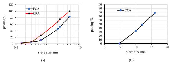 Sieve analysis for the recycled aggregates. (a) Fine aggregate FGA and CRA; (b) Coarse aggregate CCA.