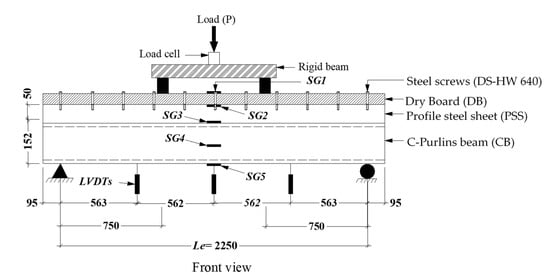 All CBPDS specimens were tested as a simply supported beam, using the test setup shown in Figure 7, all dimensions in mm. During the loading test, three LVDTs, positioned under the specimens, recorded their vertical deflection, and five strain gauges (SG), located at the mid-spans, measured changes in the longitudinal strain values of the C-Purlin beams, PSS slabs, and DB sheets. The load was applied at two points and was increased using a continuous increment (6–8 kN/min). The deflection, load, and strain values were collected and saved in a PC using a data logger device.