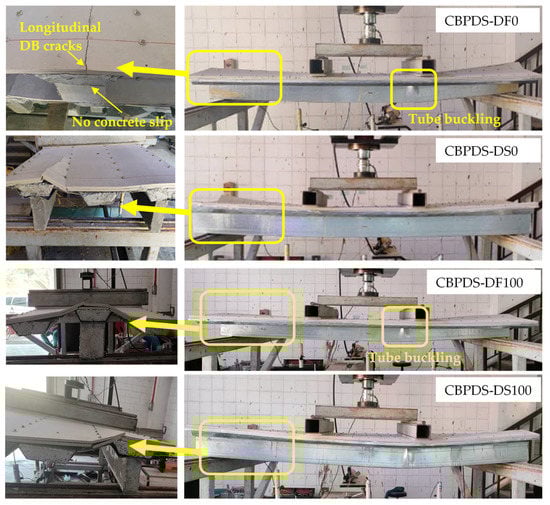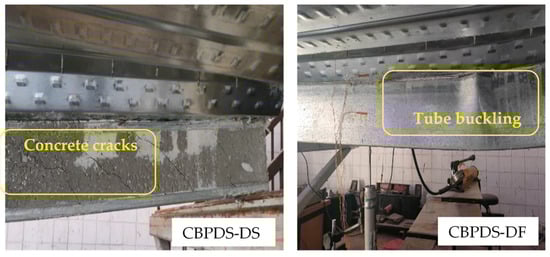 The tested CBPDS specimens showed similar bending behavior with compressive stresses at the top flange of the slab part (PDS), and tension stresses at bottom flanges of the C-Purlins beam part (CB). Generally, this performance was observed for all specimens regardless of the recycled aggregate composition of their concrete cores (0%, 50%, and 100%), and for both C-Purlins beam configurations. The specimens with double C-Purlins filled with the highest percentages of recycled aggregates (specimens CBPDS-DF100 and CBPDS-DS100) showed a typical steel outward buckling failure similar to the corresponding control specimens CBPDS-DF0 and CBPDS-DS0 (0% recycled aggregates), as compared in Figure 8. Tube buckling occurred at the top flanges of C-Purlins when the loading test passing 85% of the specimens’ ultimate bending capacity. In addition, none of the DB sheets or infill concrete materials inside the PSS slab recorded any crushing failure, as shown in Figure 9. This was due to the influence of infill concrete materials inside the PDS part, even with high percentages of recycled aggregates (50% and 100%), which is considered an important contribution to this CBPDS system.
