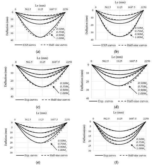 In addition, the same failure mode was observed for specimens CBPDS-DS0, CBPDS-DS50, and CBPDS-DS100 (double separate beam). However, the concrete core of these beams experienced earlier cracking failure than those with face-to-face connections; the latter configuration achieved better concrete confinement behavior, as it was fabricated in a tube shape [21,45]. Generally, these cracks started when about 70–75% of the specimens’ ultimate bending capacity was achieved, and gradually increased with increases in the loading test, as shown for specimen CBPDS-DS100 in Figure 10. Furthermore, no concrete slipping failures from the C-Purlins or PSS sections were recorded for any of the tested specimens, even at the extreme bending stage. This perfect bonding behavior between the concrete core and the steel section of CBPDS specimens was achieved due to the openings provided to casting the concrete and the embedded length of self-tapping screws used to fix the PSS to C-the Purlins beams. This behavior was recorded for all specimens, even those containing 100% recycled aggregates with double separate C-Purlins beams. All specimens showed a typical deflection behavior similar to the half-sine curve (Figure 11).