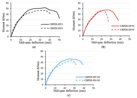 Generally, CBPDS specimens’ bending behavior was expressed as a moment–deflection relationship, as shown in Figure 12. Regardless of the recycled aggregates content of infill concrete material (0%, 50%, or 100%) and the C-Purlins’ configuration (face-to-face or separate connections), all specimens showed elastic behavior at the early loading stage (at 50–60% of each specimen’s ultimate capacity). Next, these curves showed an elastic–plastic behavior with continuously dropping slopes until the peak points were achieved at the curve. After that, their moment–deflection curves rapidly decreased due to the increased steel buckling of the PSS slabs and C-Purlins beams as well as increasing concrete cracks inside the beams at the shear span distance. However, the specimens containing 50% and 100% recycled aggregates (CBPDS-DF50, CBPDS-DS50, CBPDS-DF100, and CBPDS-DS100) exhibited slightly lower bending behavior than their corresponding control specimens (CBPDS-DF0 and CBPDS-DS0), specifically at the plastic loading stage, due to the lower compressive strength of their concrete mixtures (MC50 and MC100).