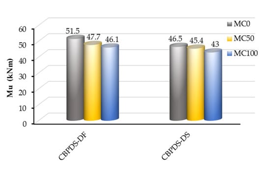 The ultimate bending strengths (Mu) obtained at the peak values of all tested specimens’ moment–deflection curves are recorded in Table 1. In addition, Figure 13 compares the Mu values of the CBPDS specimens based on their infill concrete mixture (MC0, MC50, or MC100) and according to their C-Purlins beam configuration (CBPDS-DF and CBPDS-DS). Generally, regardless of the C-Purlins connection type, specimens’ Mu values decreased as the recycled aggregate content increased, which is logical, as the concrete’s compressive strength usually decreased accordingly, as shown earlier in Table 2. For example, the Mu value decreased approximately 7% when 50% of the raw aggregate was replaced with recycled aggregates, from 51.5 kN.m for specimen CBPDS-DF0 (control specimen) to 47.7 kN.m for specimen CBPDS-DF50. The Mu value decreased approximately 11% (46.1 kN.m) when 100% recycled aggregate was used (specimen CBPDS-DF100). Therefore, it can be concluding that replacing 100% of the raw aggregate with a combination of recycled aggregates reduced the suggested composite beam–slab specimens’ concrete cores’ self-weight by approximately 15%; their Mu values decreased approximately 9–11% with little effect on overall bending behavior.