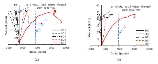 Figure 14 presents specimens’ moment–strain relationships, specifically for specimens with 0% and 100% recycled aggregates. In general, the SG1 and SG2 strain gauges measured negative strain values; this confirmed that the top fibers of specimens were subjected to compression stress due to the high bending stress at their mid-spans. In contrast, the SG5 strain gauge (fixed at the beams’ bottom flanges) showed continuous increases in positive strain values. The SG3, located at the connection surface between the C-Purlins and PSS deck slab, first measured marginally negative strain values, and then measured positive strain values when loads reached 90–97% of the specimens’ ultimate strength. This performance indicated that each CBPDS specimen’s neutral axis (NA) was within the top quarter of its beam’s cross-section; then, the NA moved upward until it was slightly above the beam–slab connection level and became slightly above the bottom flange of the PSS (see Figure 14). Moreover, the negative strain values of SG2 (fixed at PSS’ top flanges) did not reach the yielding limit even at the extreme loading stage indicating that the compression strength of specimens’ PSS slabs did not reach their yielding limits. In contrast, SG5 (fixed at the C-Purlin’s bottom flange) readings indicated that steel C-Purlins’ tensile strengths started to achieve their yielding limits when the bending moment reached approximately 85–90% of the specimens’ ultimate bending strength. Lastly, increasing the recycled aggregate content in the concrete to 100% had no effect on the moment–strain relationships of CBPDS specimens.