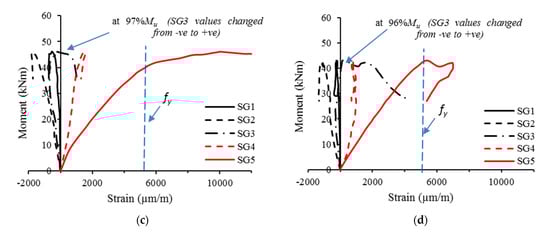 Moment versus strain relationships for specimens. (a) CBPDS-DF0; (b) CBPDS-DS0; (c) CBPDS-DF100; (d) CBPDS-DS100.