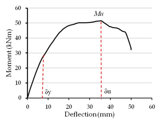 - Accordingly, the CBPDS specimens’ ductility indexes were reduced with increases of recycled aggregate content in their concrete cores; this is due to the reduction in their bending capacities. For example, the CBPDS-DF specimen filled with normal concrete (0% recycled aggregates) achieved a ductility index equal to 4.4, and this value reduced to 4.1 and 3.4 when the same specimen was filled with concrete mixture content 50% and 100%, respectively, of recycled aggregate.
