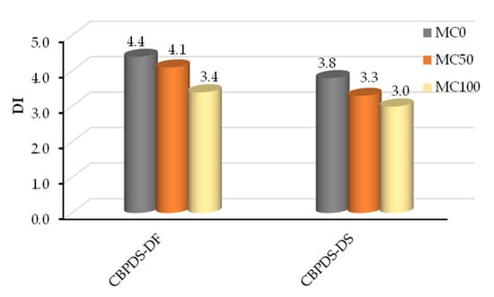 Typically, for all tested specimens, the DI value was estimated from the deflection ratio at the ultimate bending limit (δu) to that at the yielding limit (δy) [48], as illustrated in Figure 15. Specimens’ DI indices are compared in Figure 16 with reference to their C-Purlins connection type (CBPDS-DF or CBPDS-DS). Generally, regardless of beam configuration, the highest DI value was achieved by control specimens with 0% recycled aggregate content; this value gradually decreased as recycled aggregate content increased. For example, control specimen CBPDS-DF0′s DI value was approximately 4.4, compared to DI values of 4.1 (−7.0%) and 3.4 (−22%) when specimens’ infill concrete materials contained 50% and 100% recycled aggregates, respectively. Generally, specimens with double separate C-Purlins beams (CBPDS-DS) showed similar performance to specimens with face-to-face connection beams (CBPDS-DF), but with slightly lower DI values, as the specimens with face-to-face beam configurations achieved better concrete confinement, which led to improved bending performance.
