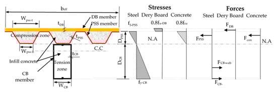 The steel tube members were classified as either slender, non-compact (semi-compact), or compact sections, according to how they buckle under compression stress [20,49]. Specifically, the AISC-2010 standard [50] classifies rectangular CFST members. The suggested CBPDS specimens’ beams were fabricated using double C-Purlins members filled with concrete materials, and classified as slender sections [20,21]. The PSS deck slabs in this composite specimen were also classified as slender sections, as the PSS sections were thin relative to the flat distance of their cross-sections, which was evident when the PSS’ top flanges buckled under compression stress (at mid-span distance due to their bending behavior). However, to date, there is no analytical model that can predict the nominal bending capacity (Mn) of the investigated composite beam–slab member (CFST beam carrying a PSSDB/PDS slab). Therefore, in this study, a new theoretical model was developed using the stress block theory, as shown in Figure 17. The main assumptions adopted in the development of this model are as follows: