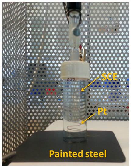 EIS measurements were performed using a Solartron 1286 potentiostat (“electrochemical interface”) in conjunction with a Solartron 1250 frequency response analyzer (Solartron Instruments, Farnborough, England). Instrument control and the fitting of the measured impedance spectra were performed using CorrWare/Corview version 3.5f and ZPlot/Zview version 3.5i software (Scribner Associates, Inc., Southern Pines, NC, USA). The electrochemical cell was a three-electrode cell with a saturated calomel electrode (SCE) as the reference electrode, a platinum wire as a counter electrode and the paint-coated sample as a working electrode. The body of the cell was a glass tube (Ø 22 mm), which was mounted to the painted steel with epoxy glue (Figure 2). Measurements were performed in 20 mL 5% NaCl solution at room temperature. In order to monitor the time dependence of corrosion, we compiled a series of measurements in which the open-circuit potential (OCP) and EIS measurements were repeated cyclically. Impedance spectra were recorded at OCP using a 10 mV effective amplitude sinusoidal signal with 10 points per decade over frequencies ranging from 10 kHz to 10 mHz.
