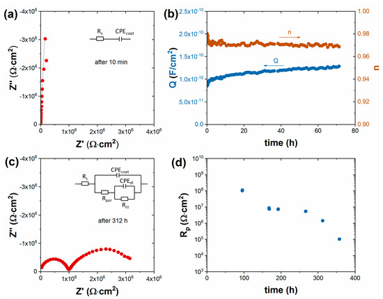 Figure 3 shows the results of the impedance measurement series on single-coat-painted (68 μm) cold-rolled steel in 5% NaCl solution. In the beginning, the coating acted as a barrier with no electrochemical reaction taking place. For several days, only the frequency-dependent non-ideal capacitance of the coating could be determined from impedance (Figure 3a). Impedance spectra in this time period could be modeled with an equivalent circuit containing only the coating capacitance and solution resistance, as indicated in the inset of Figure 3a. These impedance characteristics were typical for defect-free coatings. An increase in coating capacitance took place with increasing time, which was due to the water uptake process (Figure 3b). The polarization resistance could be determined from impedance only after 4 days, which indicated the start of the corrosion processes (Figure 3d). When corrosion started, the polarization resistance decreased continuously. At the end (312 h), the spectra became two-time-constant, containing the Faraday impedance and coating elements typical for damaged coated metals (Figure 3c).
