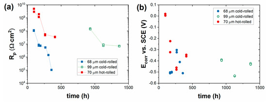 Figure 6 shows the time variation of polarization resistance (Rp) and corrosion potential (Ecorr) of the heat-treated painted steel samples determined by a series of electrochemical impedance spectroscopy measurements. In the case of thinner (60–70 μm) coatings, Rp could be determined immediately after contact with a 5% NaCl solution. The value of Rp was initially in the range of 109 Ω·cm2 and decreased continuously over time. This was because the electrolyte reached the substrate steel through the microcracks in the coating, and the corrosion process could be measured by impedance measurement in the early phase of corrosion. The corrosion potential (Ecorr) values were around −400 mV vs. SCE in the beginning, which indicated that active iron dissolution was taking place. A slight difference between the Rp values was obtained depending on the type of heat treatment and the type of steel substrate, but the difference was not significant.