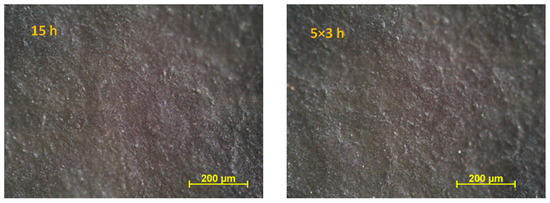 Comparative tests were performed to study the effect of heat treatment on the corrosion resistance of the coatings. Thermal equipment during operation may reach 300 °C, which is a critical temperature with respect to adhesion due to the formation of thin oxide on the steel surface [22]. For this reason, this temperature was chosen to maximize the stress on the coating. The effects of short cyclic heat load (5 × 3 h) and long-term single heat load (15 h) at 300 °C on the corrosion resistance of the coated steel sheets were compared. The cyclic method more realistically characterizes the thermal expansion conditions that may occur with a wood-heated fireplace, while the continuous method simulates a steadily operated chimney. Figure 5 shows the optical microscopic images of heat-treated panels. Microcracks were formed in the coatings in all heat-treated samples due to different thermal effects, e.g., thermal expansion. Cyclic heat treatment caused more drastic changes in morphology; the cracks were slightly wider and longer than those in the case of single continuous heat treatment. Microfractures are typically 1–5 microns wide.