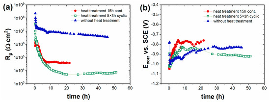 Time variation of (a) polarization resistance and (b) corrosion potential of heat-treated single-layer-painted steel panels in 5% NaCl solution.
