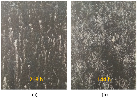 The method of steel sheet processing (cold-rolled, hot-rolled) can also play a role in the corrosion resistance of heat-resistant paint coatings. Especially in the case of cold-rolled steels, oxide formation can be significant at higher temperatures, which can result in coating adhesion problems. Therefore, we also examined the effect of the processing method of the base metal on the corrosion-resistance properties. It was revealed that the type of steel substrate (cold-rolled and hot-rolled) had no significant influence on the anticorrosion behavior of coating (Figure 4). The onset of corrosion was practically the same for the two types of steel, 95 h and 97 h. This was consistent with the test results of the salt-spray chamber (Table 1), where only small differences were observed between the exposure times referring to the unchanged condition of painted cold-rolled and hot-rolled steel sheets. In all cases, the corrosion took place only at a few defect points of the panels after the salt-spray chamber test.