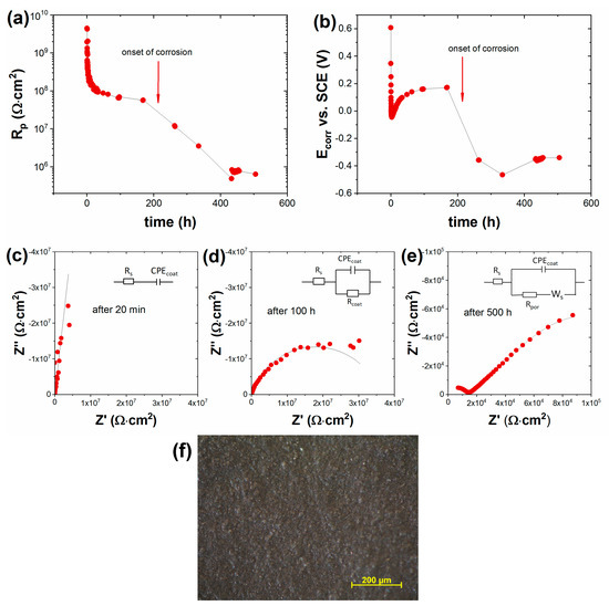 The above-described time dependence of corrosion behaviour is well illustrated by the shape of impedance spectra shown in Figure 10c–e. Initially, in the first few minutes, only the coating capacitance and solution resistance characterized the system (Figure 10c); the coating resistance could not be determined, or could only be determined with a large error. After 1 h, the coating resistance became measurable, and the impedance spectra between 1 and 200 h could be fitted with a one-time-constant equivalent circuit model Rs(CPEcoat|Rcoat) as shown in Figure 10d. After the start of corrosion, the second time-constant characteristic of the Faraday reaction of corrosion appeared in the spectra, which was a diffusion-controlled process, and could be fitted with good accuracy with a finite length diffusion element (Figure 10e).